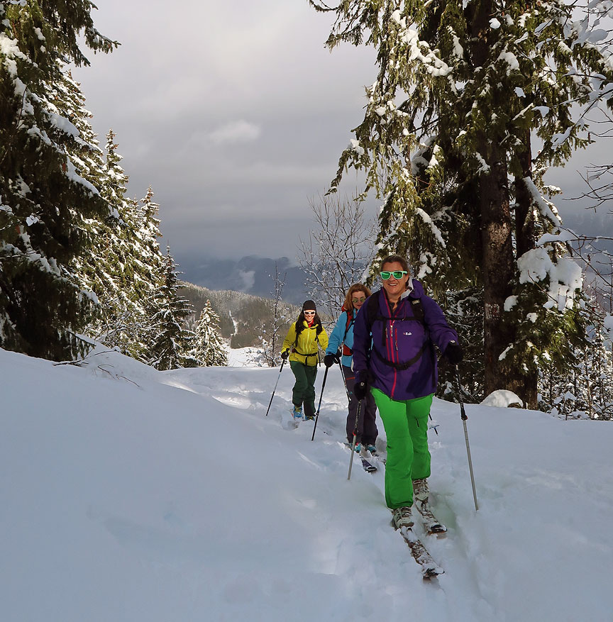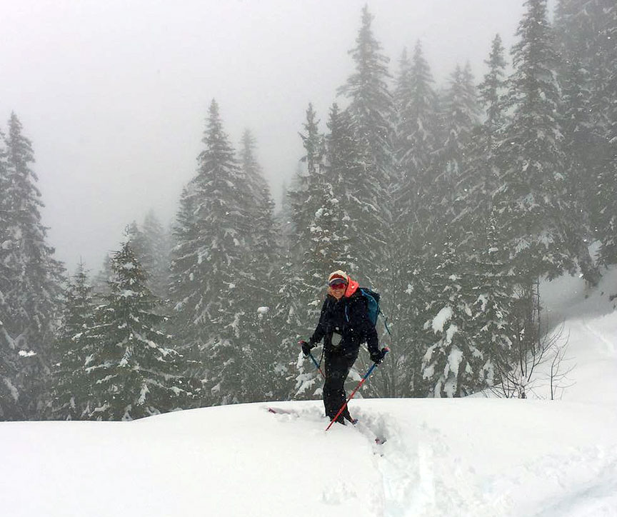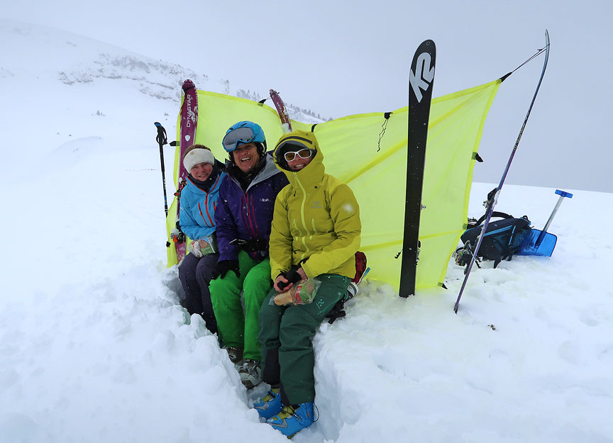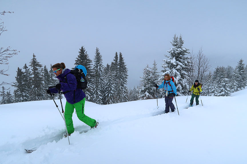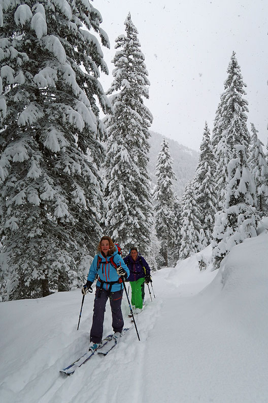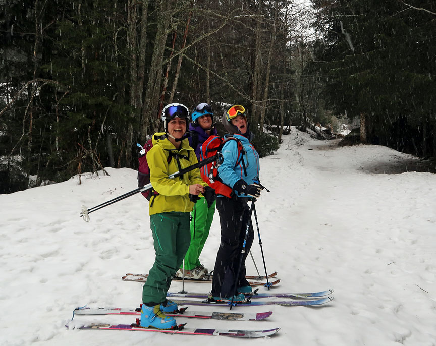 Kate and her family have skiied with Kathy on and off piste at various times over the past 5 years. Last year, Kate and some of her family branched out into touring, and she was hooked. She invited a couple of her friends to join her this year for an introductory 3 day ski touring outing. As you'll see, our long dry spell ended quite abruptly, and just as they arrived, in a storm that literally did not let up for the entire three days! We made the best we could of it, and did manage to have a lot of fun and the deep snowy woods were beautiful. The snow was great at times, indeed our main complaint was too much of a good thing! |