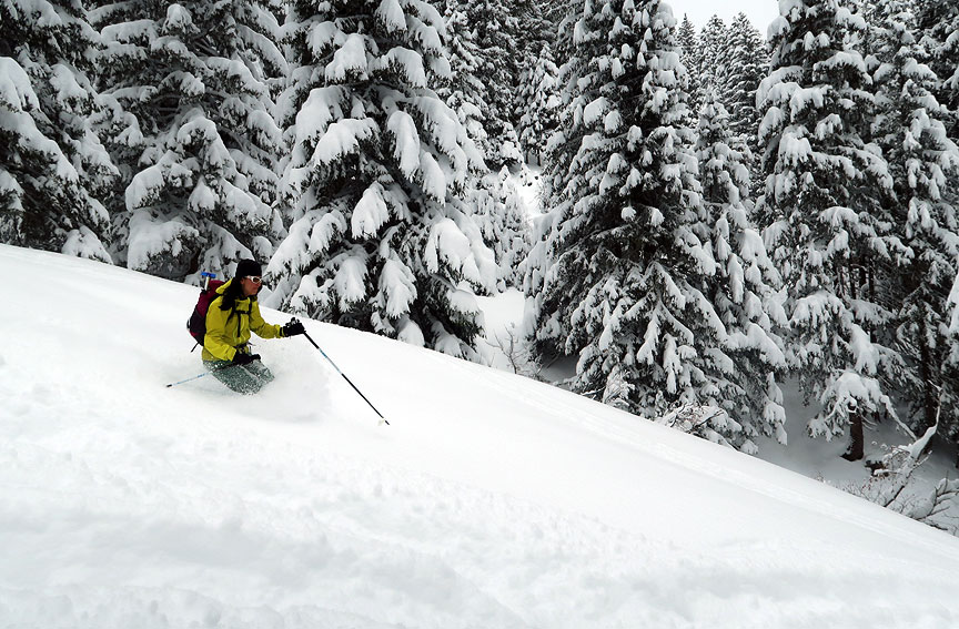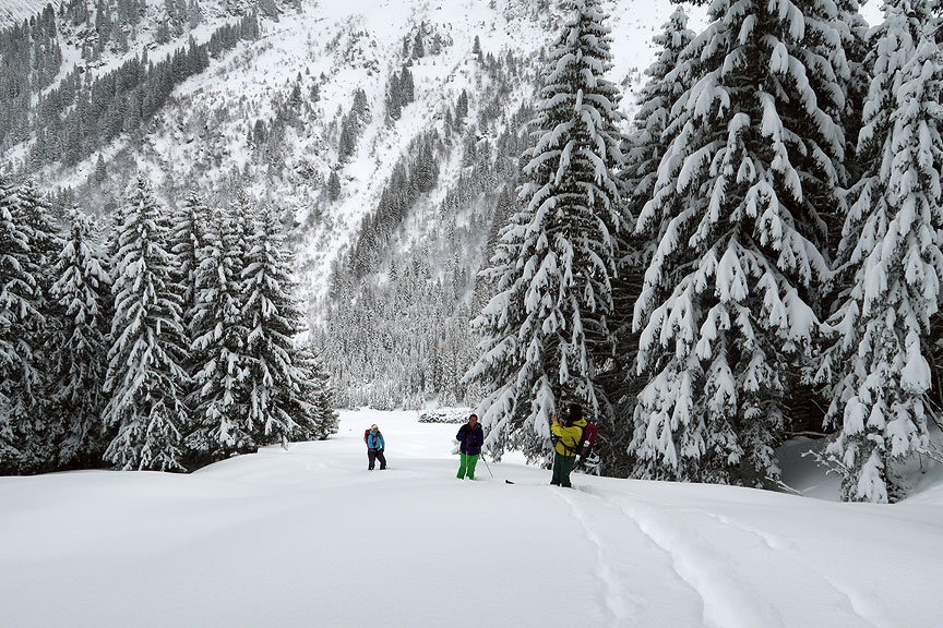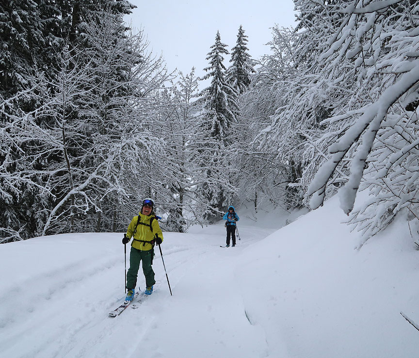 Today's tour was up into the high country above "Romme sur Cluses", a lovely little mom and pop drag lift area far above the Arve river in the northere Aravis. Again, beautiful woods packed with new snow. |