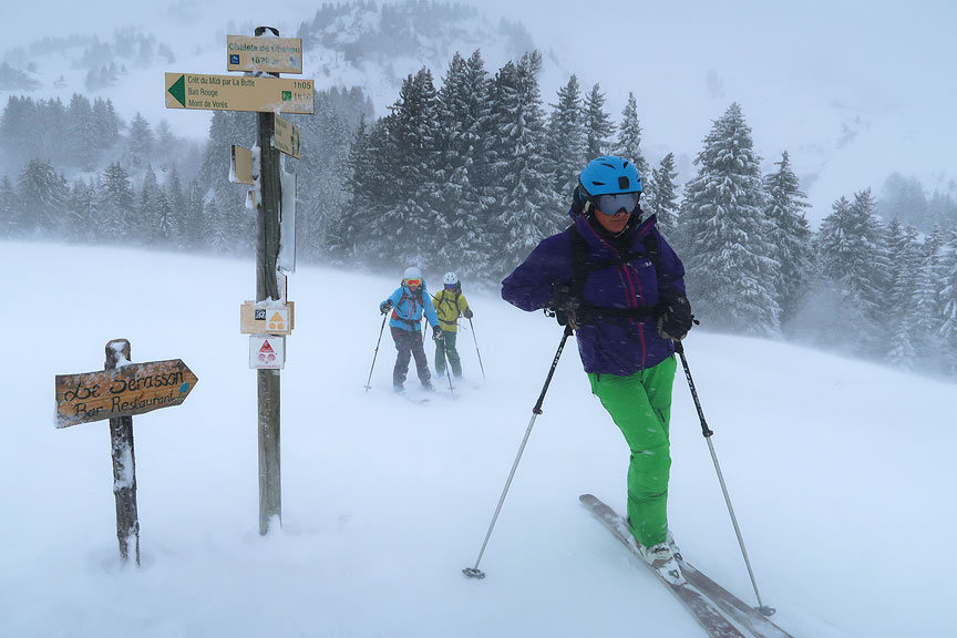 Our first day was the worst forecast we've seen in a long time: lashing rain/snow, and high winds even at low elevations! So we hatched a conservative plan, sticking mainly in the woods and keeping out of trouble. We started out in the neighborhood of the Praz Sur Arly ski area, near Megève. A "before" photo, still dry and in good spirits, if a bit incredulous that we are going outdoors in the rain! |
