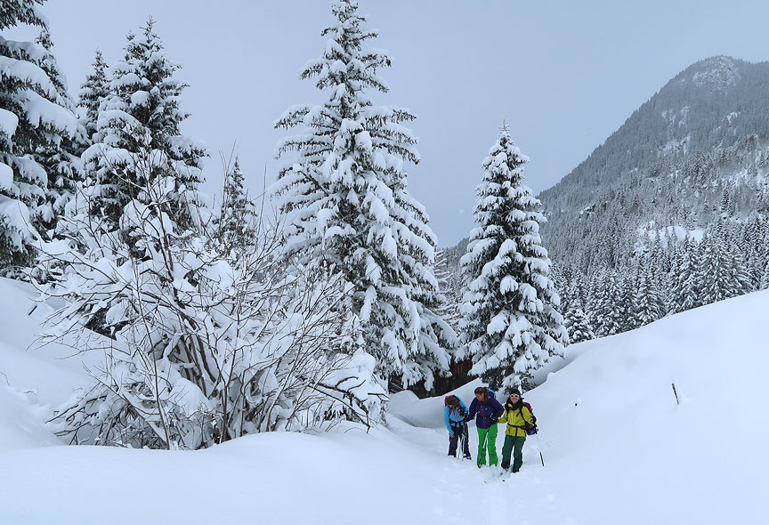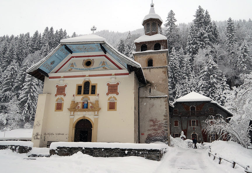 Our second day dawned only slightly better; the wind was down but it was still snowing heavily. We opted to again stick mostly to the woods and meadows where we could be assured of safe slopes not exposed to avalanche hazard. We began our walk at the beautiful chapel of Notre Dâme de la Gorge, dating from the turn of the 17th to 18th centuries. |