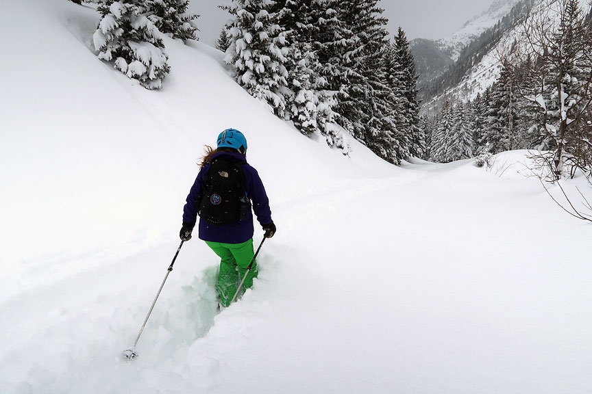 We couldn't resist a detour to ski a moderate-angled glade through the woods. Burly trail breaking! |