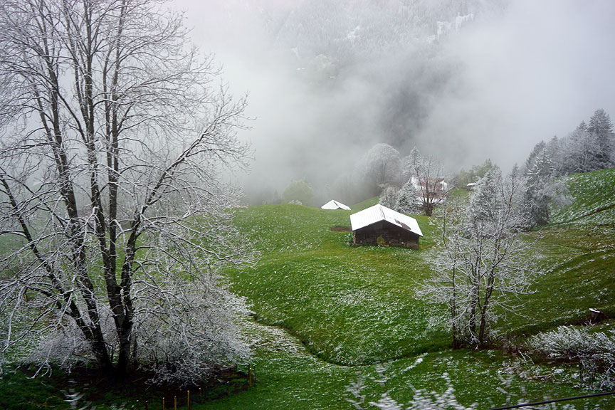 Our arrival to the Jungfrau region coincided, as it so often seems to do, with a heavy Spring snowstorm to low elevations. Green pastures briefly turned white again; trees just budding were coated in snow. |
