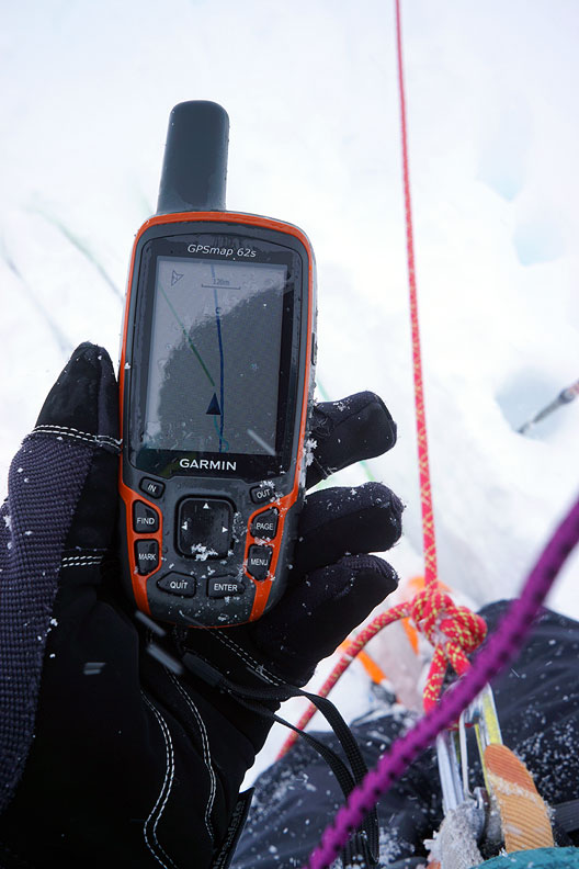 As we are wont to do in these situations, we broke out both rope and GPS to descend the crevassed glacier in the fog. Slow progress and a challenge on many levels, it at least allowed us to stay on schedule in hopes of better things later on. |