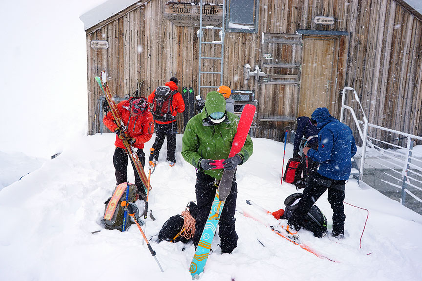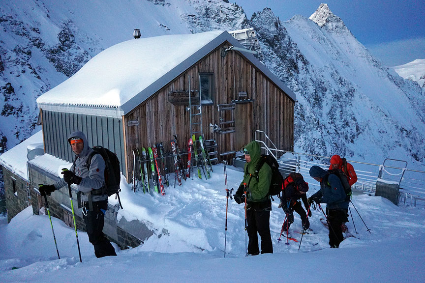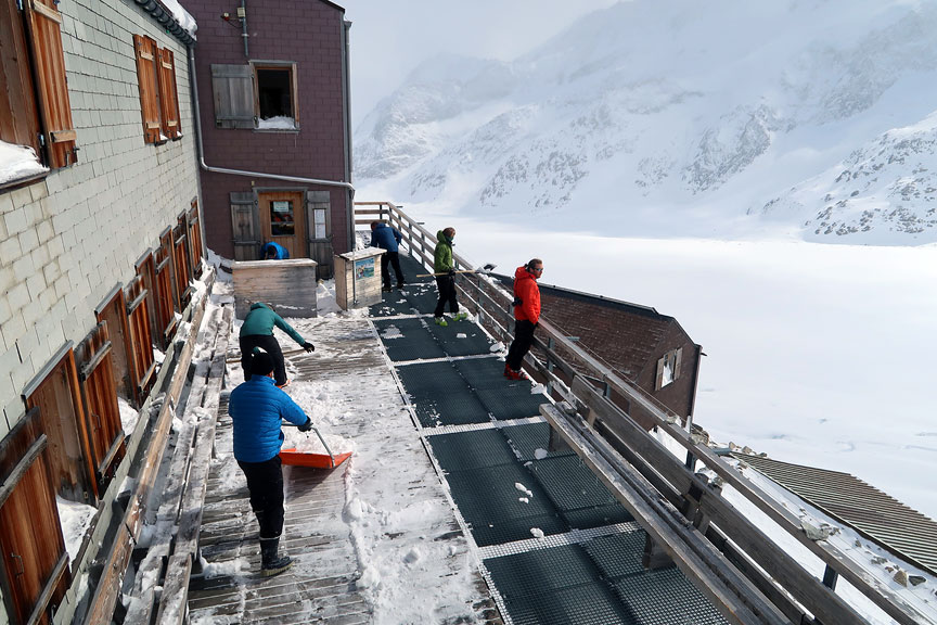 Day five found us once again enveloped in snow and fog. We made our way slowly and laboriously back up over the Grünhornlücke, past the Konkordia hut, and onward to the Hollandia hut. |