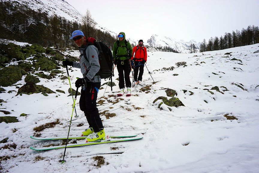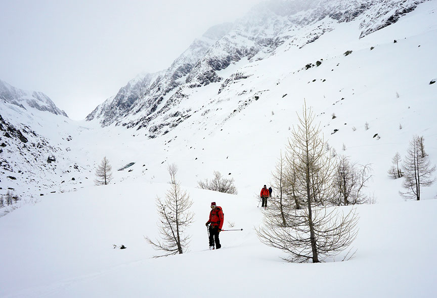 After a brief stop back at the hut, we descended into the Lötschental as the high clouds thickened. Still great snow! Light and fulffy. |
