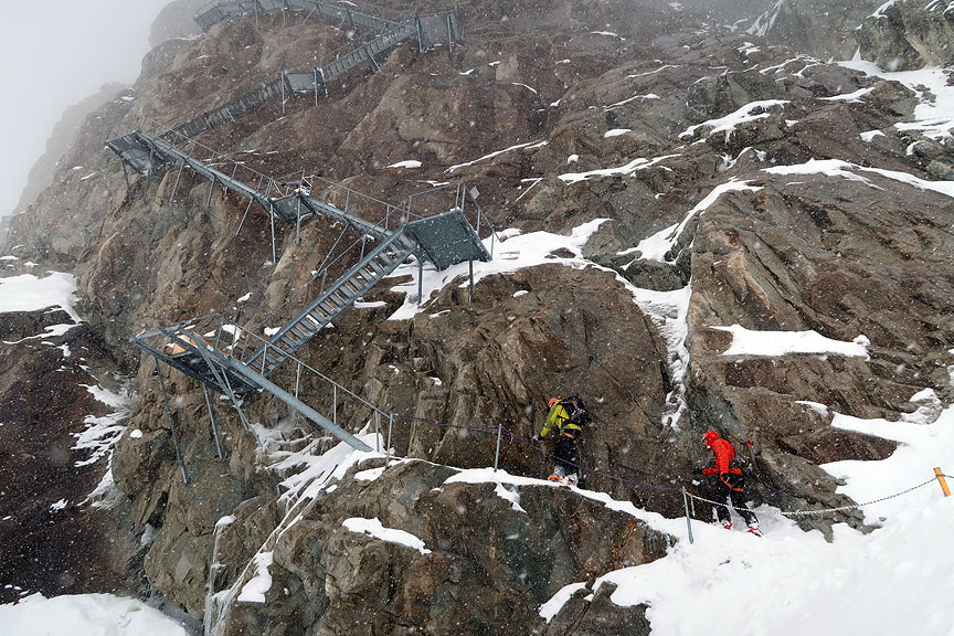 In the mid afternoon, the snow still falling heavily, we arrived at the base of the Konkordia hut's approach stairs. |