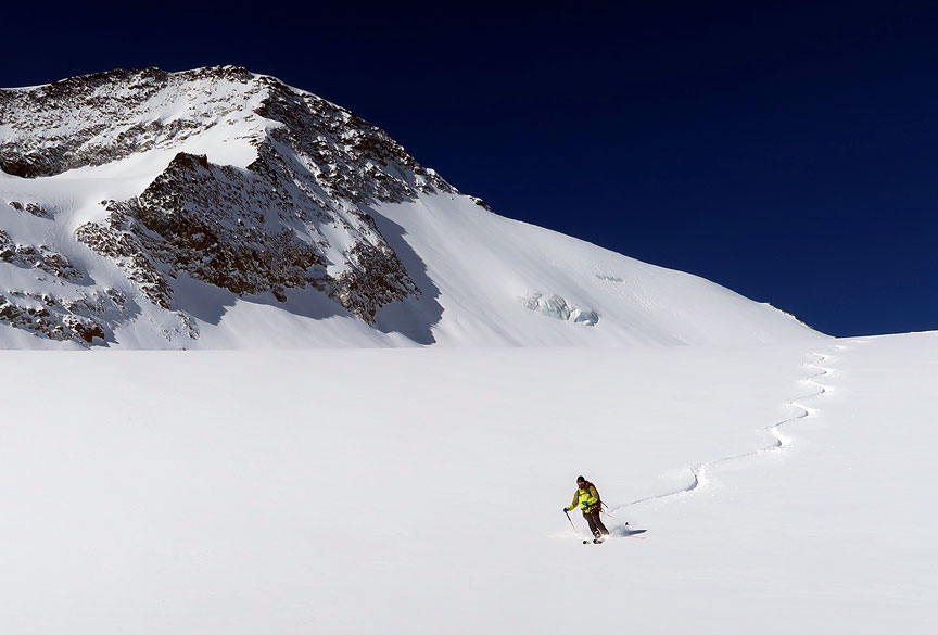 Crossing the Grünhornlücke, we have freshies down the other side! |