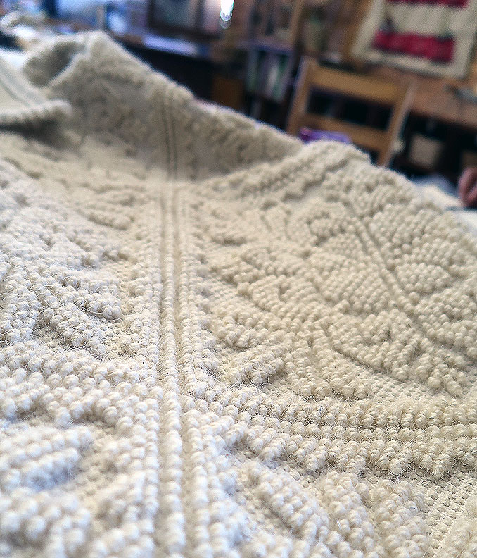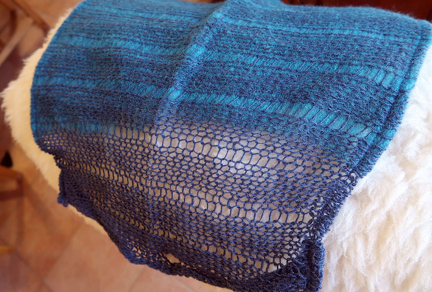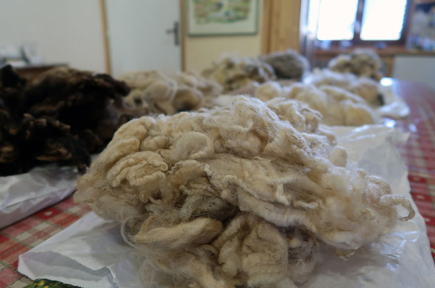 On our first morning we dug into the first of our three days of woolly workshops. A short drive up toward the Col d'Izouard of Tour de France bike racing fame, we settled in to our venue in the village of Cervières. The hostess Bernadette keeps a flock of sheep with her husband, and they have built a beautiful work space perfectly suited to small groups. So, our day 1 entailed lots of information from THE expert on European sheep and their wool, Marie-Thérèse Chaupin of "l'Atelier Laines d'Europe". She gave us not only tons of information from pictures and her own store of knowledge, but also hands-on exploration of wools both rustic and highly cultivated; we gained an understanding of their varying characteristics, as well as the products those variations best suit them for. We learned more than we ever suspected there was to learn about wool! The following three images are examples Marie-Thérèse had brought to show us some of the finest examples she had of the uses of some of these wools. |