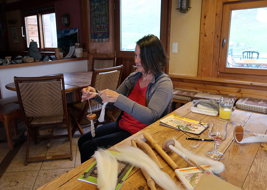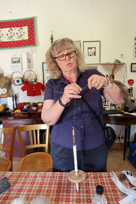 After a pause for lunch, we tackled some hands-on skills, beginning with carding wool. Not as easy as Marie-Thérèse makes it look! |