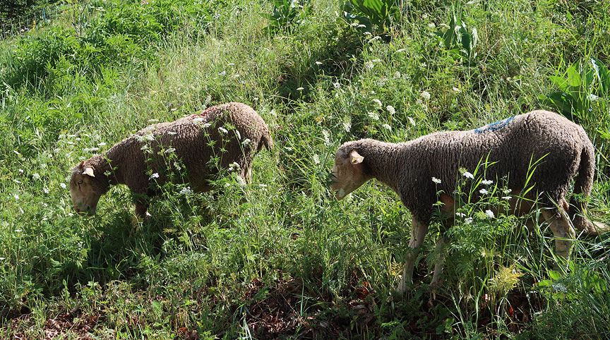 On our final morning, we drove up to the Col de Rousset to see the sheep newly arrived and happy as clams in the cool mountain air, after having marched through the night from Die to the Col. Hungry, and enjoying the abundance of fodder. |
