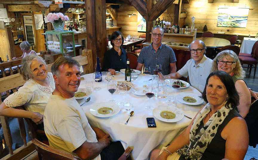 But all's well that ends well. We met up with the various male counterparts of our group, who were having adventures of their own in the mountains with Mark (except for Robin's husband, who was home sailing, taking care of the cats, and having his own kind of fun!). We enjoyed a fantastic final meal all together in Chamonix, catching each other up on the high points of our week. From left to right: Kathy, Mark, Pamela, Matthew, Russ, Deb, and Robin. Thanks to all of you for making this such a fun-filled and wonderful week. |