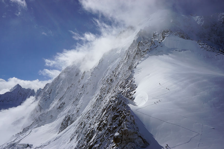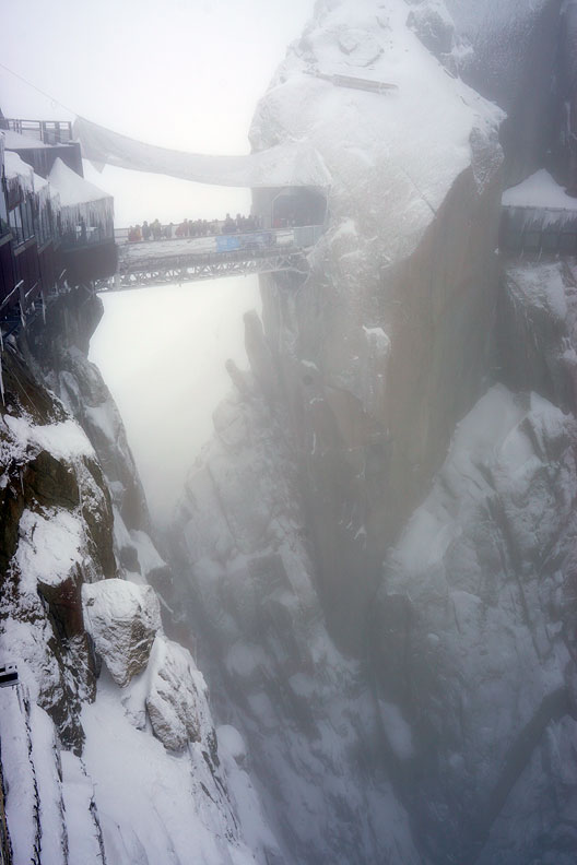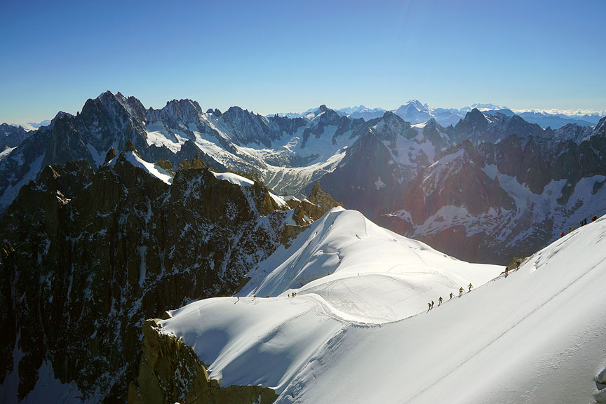 The following day, our 3rd, was perfect. Picking up where we had left off, we head to the Marbrées. This is the view from the summit of the Aiguille du Midi, as we traverse the peak via cable car. |