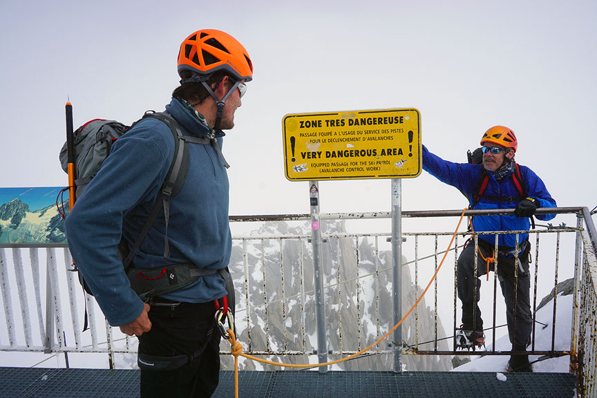 For our second day, we had hoped to traverse the Aiguilles Marbrees. However, due to cloudy weather and wind over the Italian side, the Panoramique lift (needed to get close to our objective) never opened. |