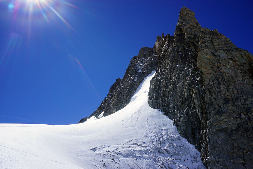 On day 4, we did the Arête Laurence, and the Arête des Cosmiques. on the Aiguille du Midi. Mouse over to see the line. |