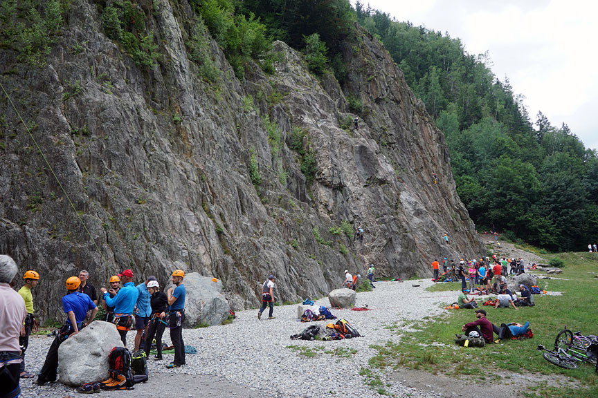 One our second day, we started up in the Aiguille Rouges, hoping to climb a route called Somone. But rain and persistent cloud chased us back down into the valley. The afternoon was put to good use, however with a lead climbing clinic at Les Gaillands, the local city park-cum-rock climbing crag. A busy place on a marginal weather day. |