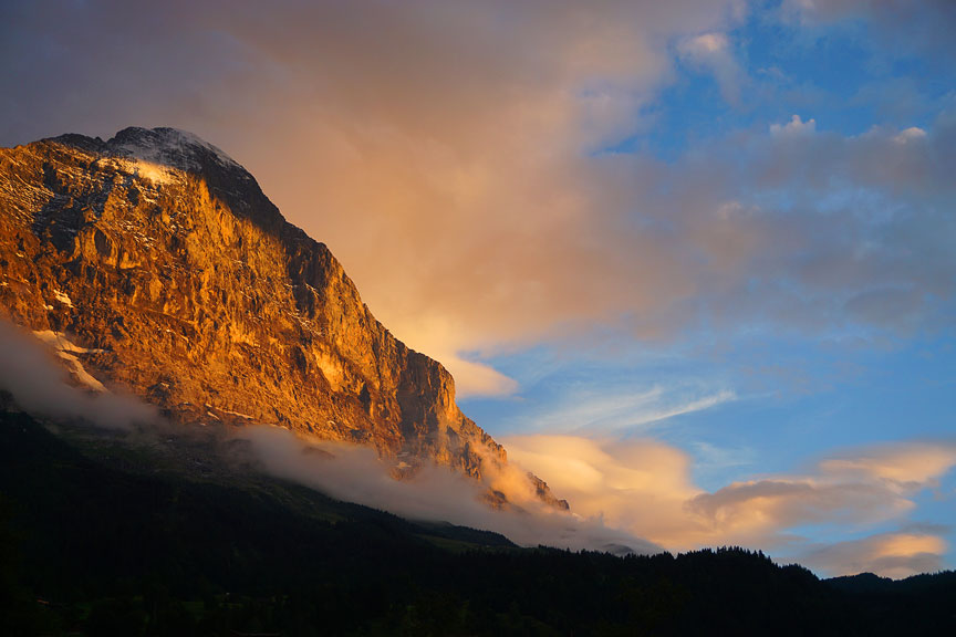Back in Grindelwald for the night. The sun slices though the cloud on the North Face of the Eiger. |