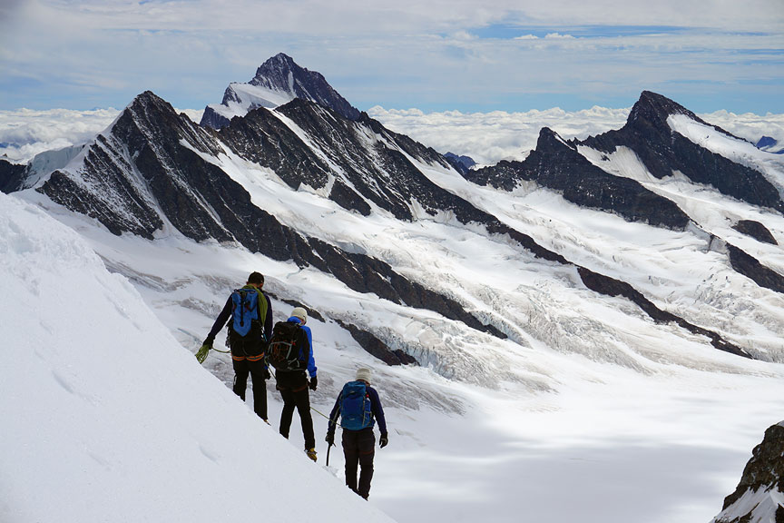 With a better forecast, we decide to return for a one-day climb of the Mönch. Here's Mike and Jim on the SE Ridge. |