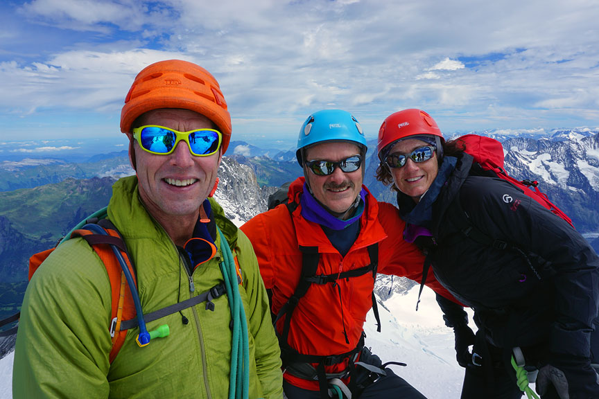 Kathleen and Jim Soukup, from New Hampshire, joined Mark and fellow guide Mike Powers, for 6 days in late July. Our original plan included the Mönch, Jungfrau, Wetterhorn and Eiger. But a very dubious weather forecast required some significant alteration. For more adventures with Kathleen and Jim, see some photos from last summer's climbing in the Chamonix area. |