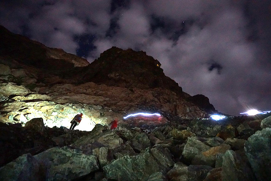 Breakfast at 3:30 am and we are out the door at 4:00. More climbers making their way down the rubbly trail to get on the glacier. |