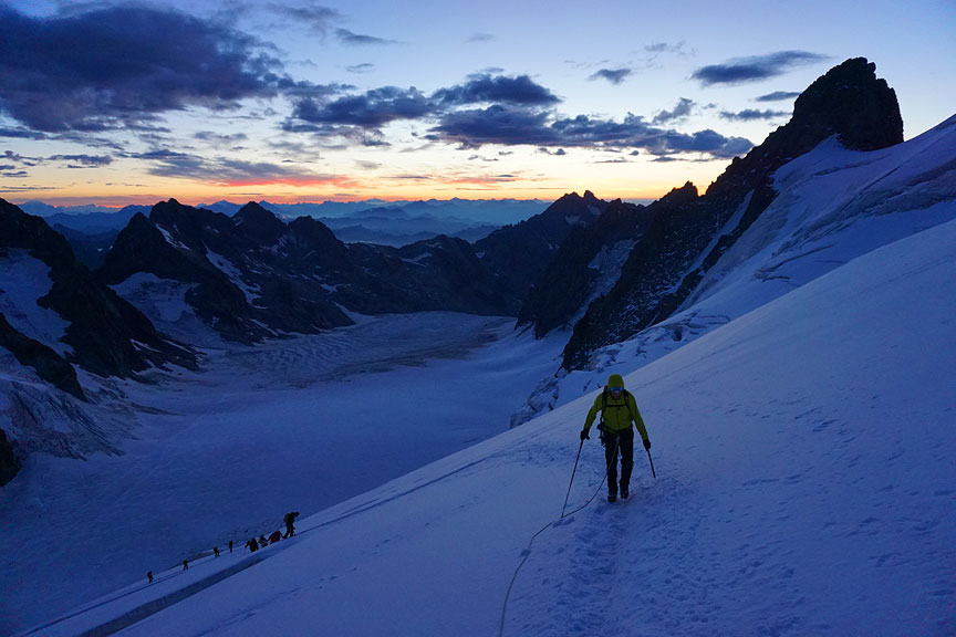As we start up the NW Ridge of the Barre, we look back over the Dôme de Neige. Fortunately, most of the climbers on the glacier that early morning were climbing on the Dôme, leaving the somewhat more complicated Barre to only a few of us. |