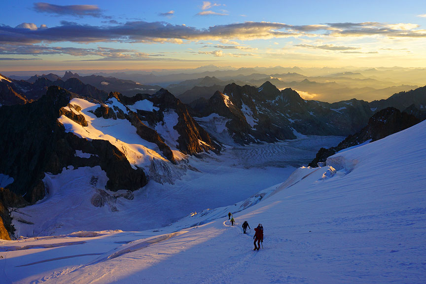 Some time later, high on the Glacier Blanc the sun lights up the eastern sky. |