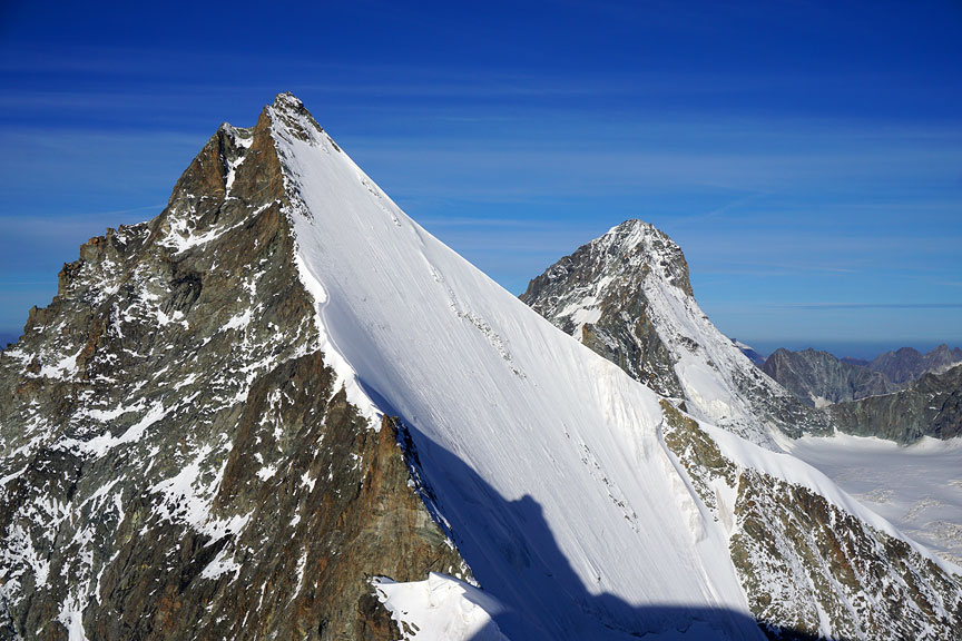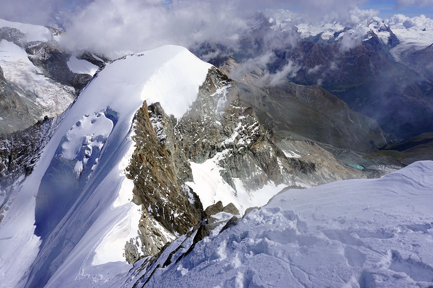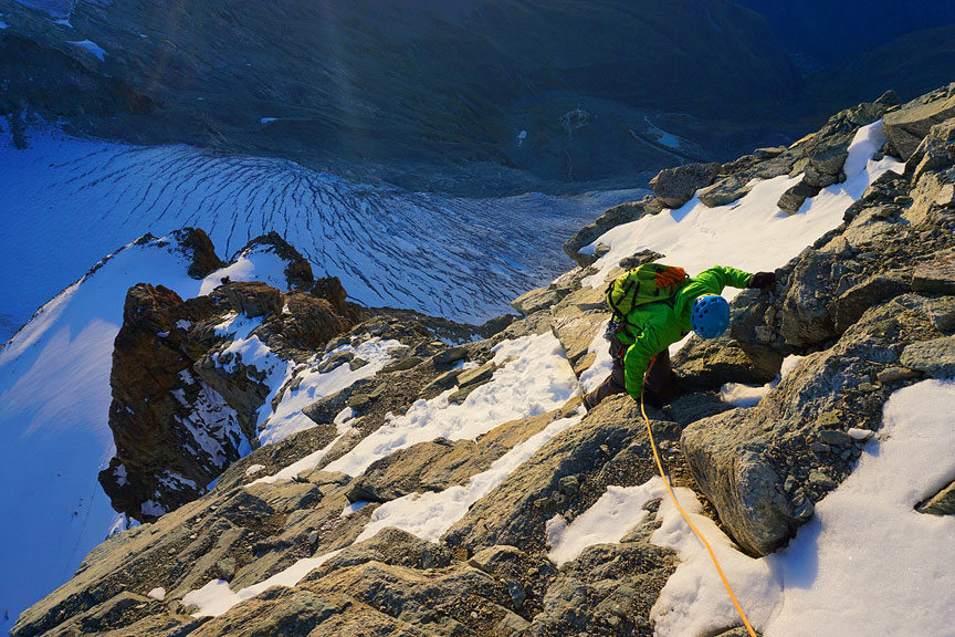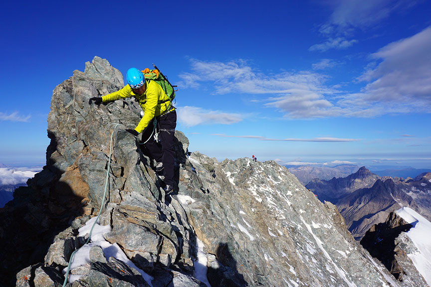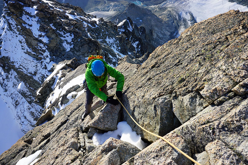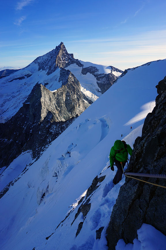Here, we are traversing the Grand Gendarme, a tower on the ridge that separates the Wellenkuppe and the Obergabelhorn. Zinal Rothorn behind. |