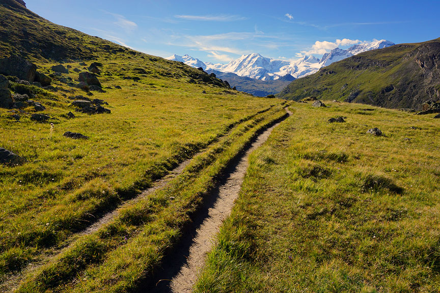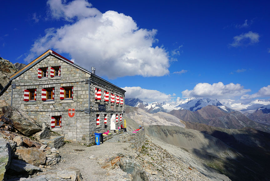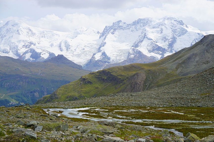 After check in various weather forecasts, and calling some huts for updated conditions information, we head to Zermatt and hike into the Rothorn hut. Liskamm and Breithorn from the walk into the hut. |
