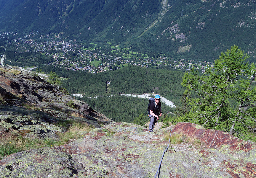 Breaking out above the treeks, with the greater metropolitan area of Chamonix spread out below. |
