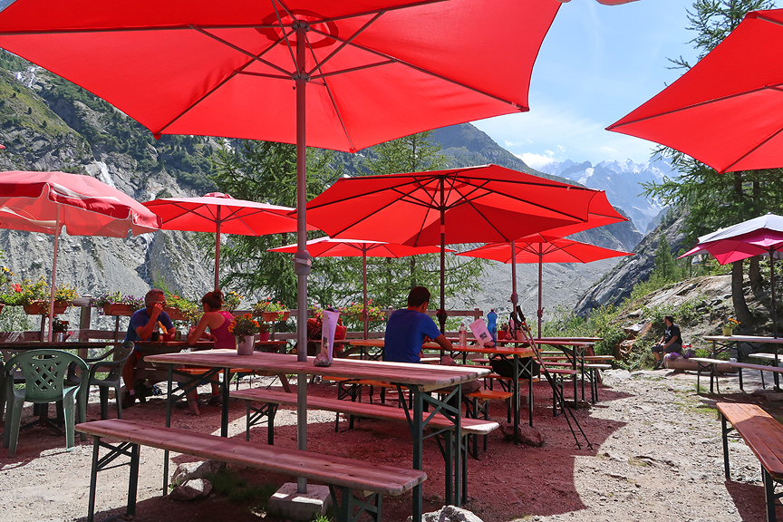 At the top, the charming buvette at Les Mottets is a welcoming spot for a cool drink, with views of the Mer de Glace (more like Mer de Stones this year) in the background. |