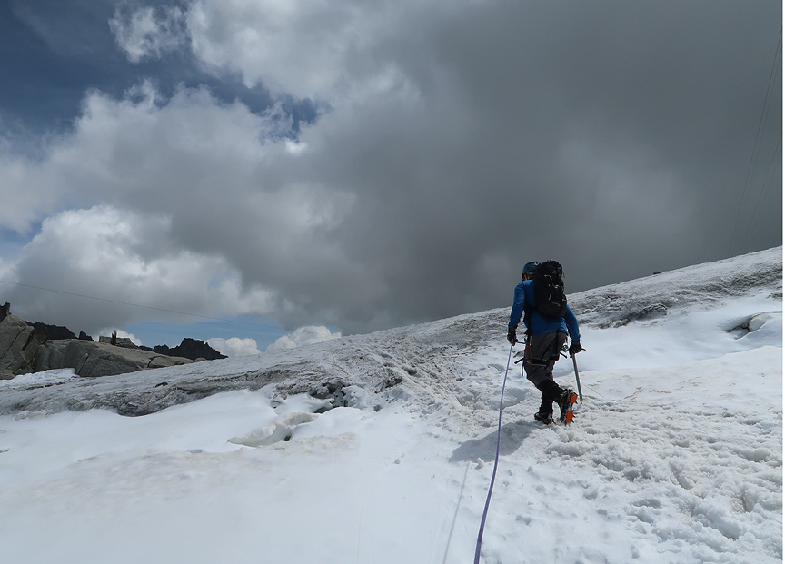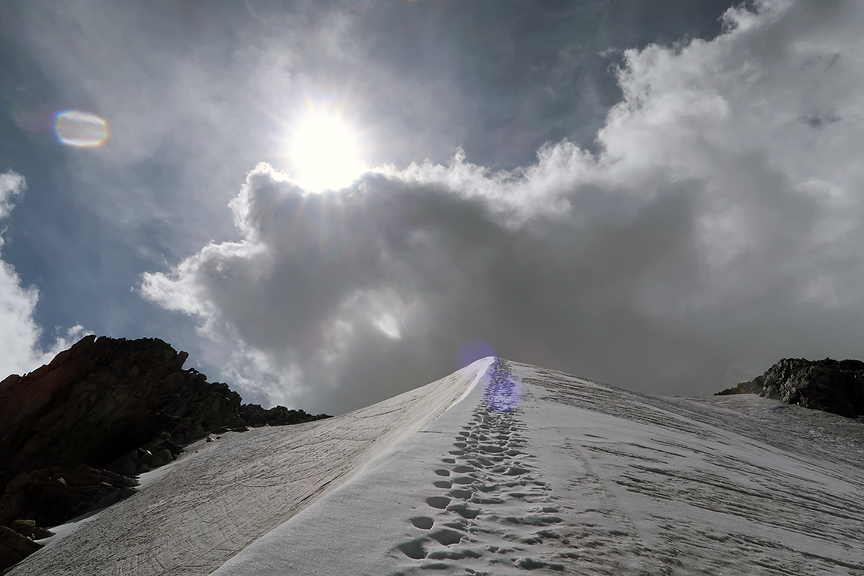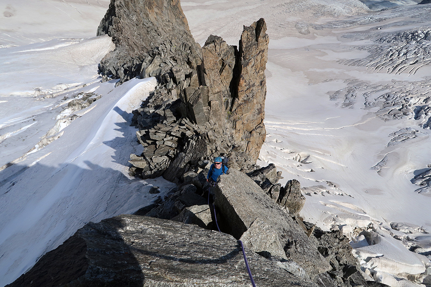 Near the top, the rock part of the ridge ends and the rest is steep snow/ice along a shallow crest to the summit. |