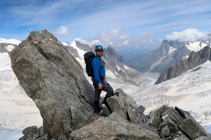On the summit! The Mer de Glace snakes away in the distance. |