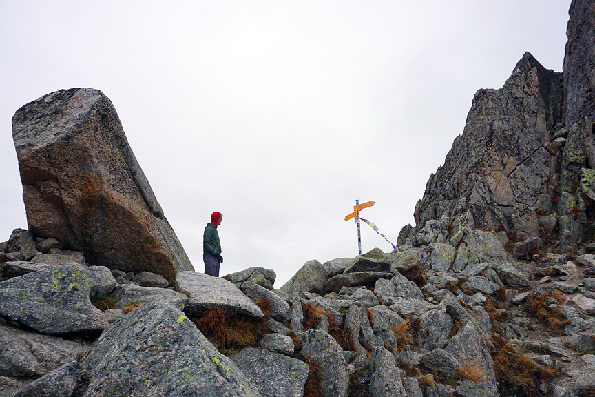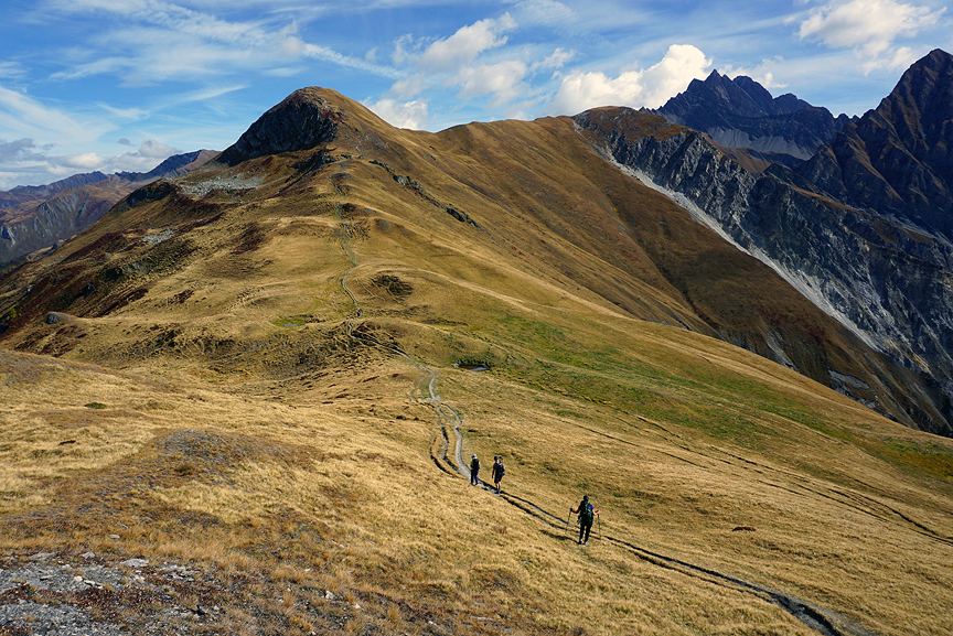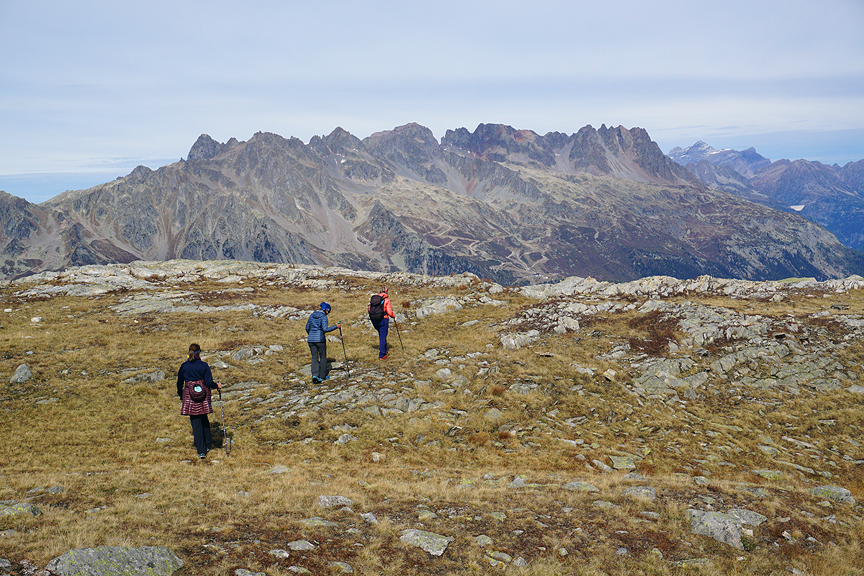 A long, tough climb through boulders and steep track brings us at last to the Fenêtre d'Arpette, one of the two highest points of our trek. |