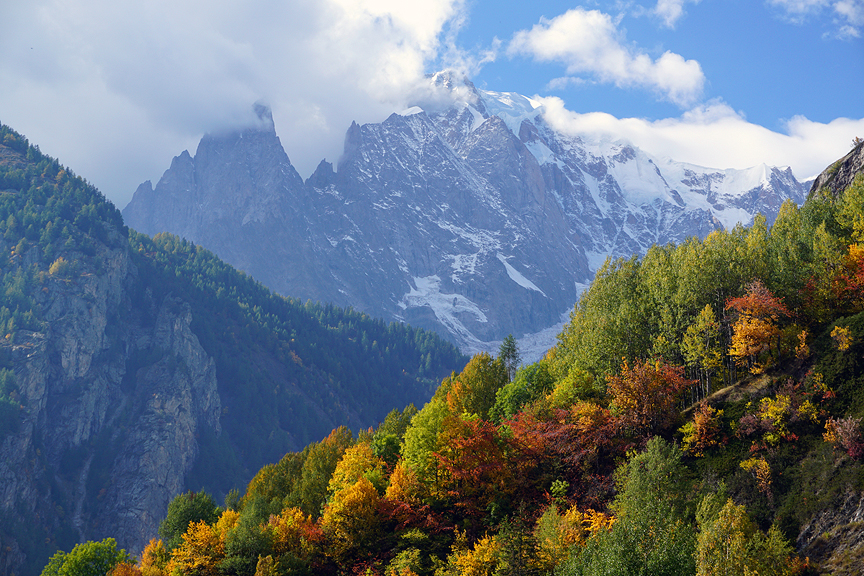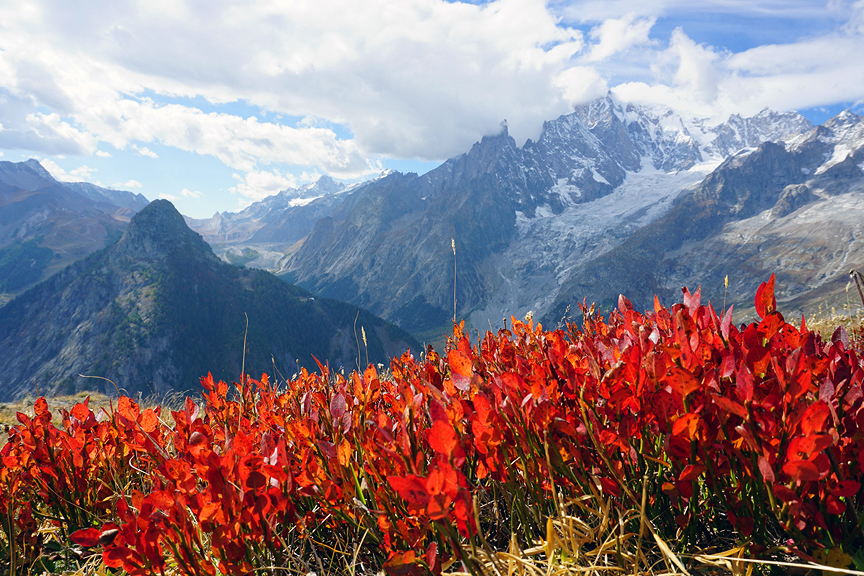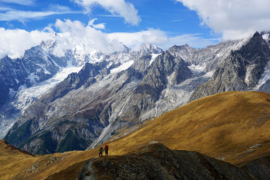 Our trail winds high along the ridge top, nothing now blocks our view of the outrageous southern flanks of Mont Blanc. |