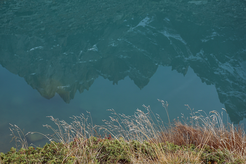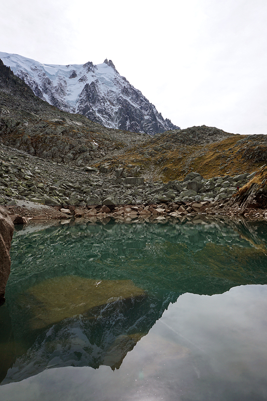 The Aiguille du Midi reflected in the still waters of Lac Bleu. |