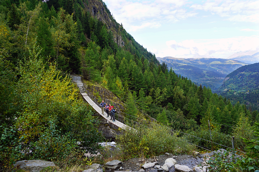 Day 1, not long after starting out, we cross the hanging bridge over the Torrent de Bionnassay. |