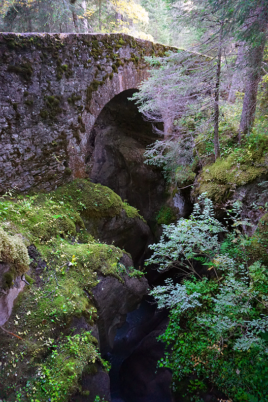 The aforementioned gorge lies a couple of kilometers up a steep forest road. The site of an ancient roman route, this bridge spans the dark and cavernous slot canyon. |