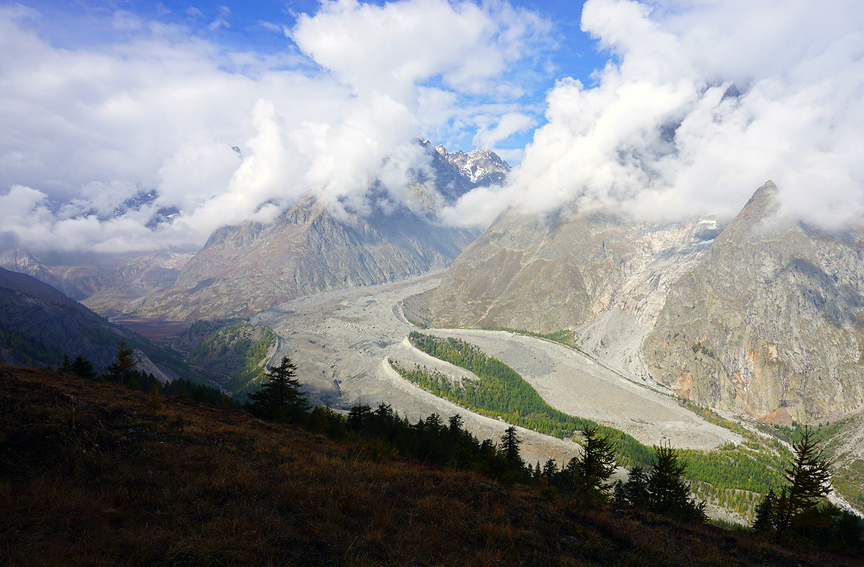 Incredible views into the Val Veny, over to Mont Blanc, and the astounding moraines of the Glacier du Miage. |