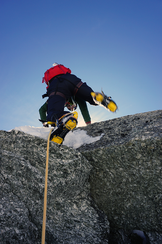 Things getting exciting on the North Ridge of the Petit Flambeau. Not quite as burly as this photo looks, or at least not continously so. A good challenge, all the same. |