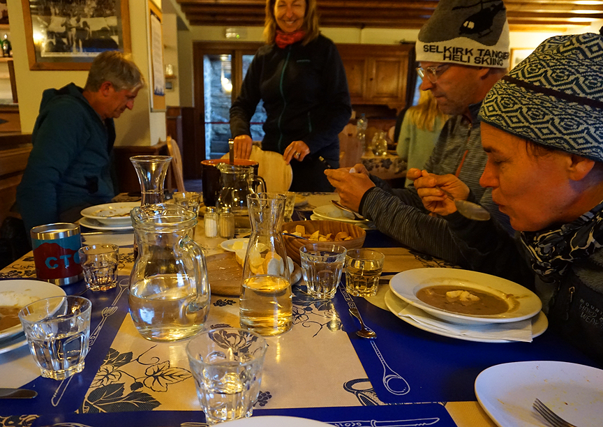 The warm and friendly Elisabetta hut awaits us, with all the comforts we need, and then some. Including (excellent) wine from the innkeeper David's own family vineyards. |