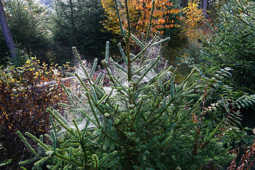 Dewdrops highlight delicate needles and cobwebs in the places the sunlight breaks through. |