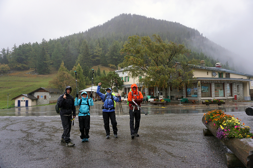 Hunkering down in the lee of the (closed) refuge, we briefly escape the lashing rain and steady wind. But it's all downhill from here, to Le Tour, and a bus! |