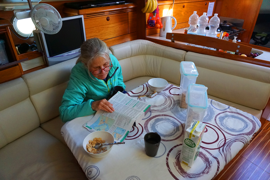 Over breakfast Kathy studies the Almanac for important planning information. |
