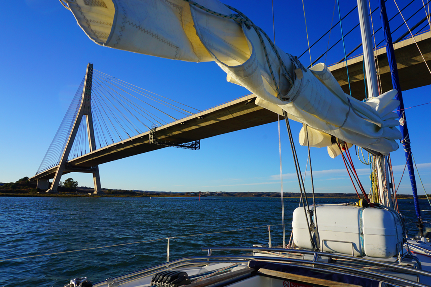 On our 3rd day, we planned a trip to nearby Marina Isla Canela, hopefully putting to use our navigation skills, as well as passage planning. With an overnight at Isla Canela, we returned to Ayamonte the following day, more training and manoeuvres on the way. Part of the course included some night-time sailing. And on the 4th day, after a leisurely morning going over such things as diesel engine maintenance (the tide was really setting our schedule, as it always does), we motored up the Rio Guadiana, continuing well upriver after sunset. Here, we are passing under the bridge between Spain and Portugal. Once it was quite dark out, we returned down river, using the lights of the buoys to guide us. |