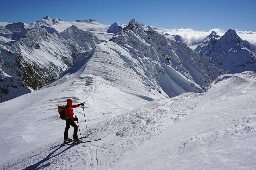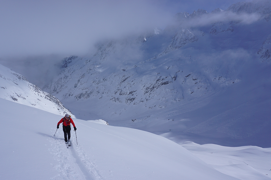 But the sunshine would not last. High cloud came in, with flat light. Here we are, arriving on the summit of the Tête Blanche. The long ski down was actually pretty good. |