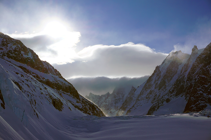 For our last day of touring, we climbed up over the Col du Passon. Here's the slightly ominous view from the Argentière Glacier. |
