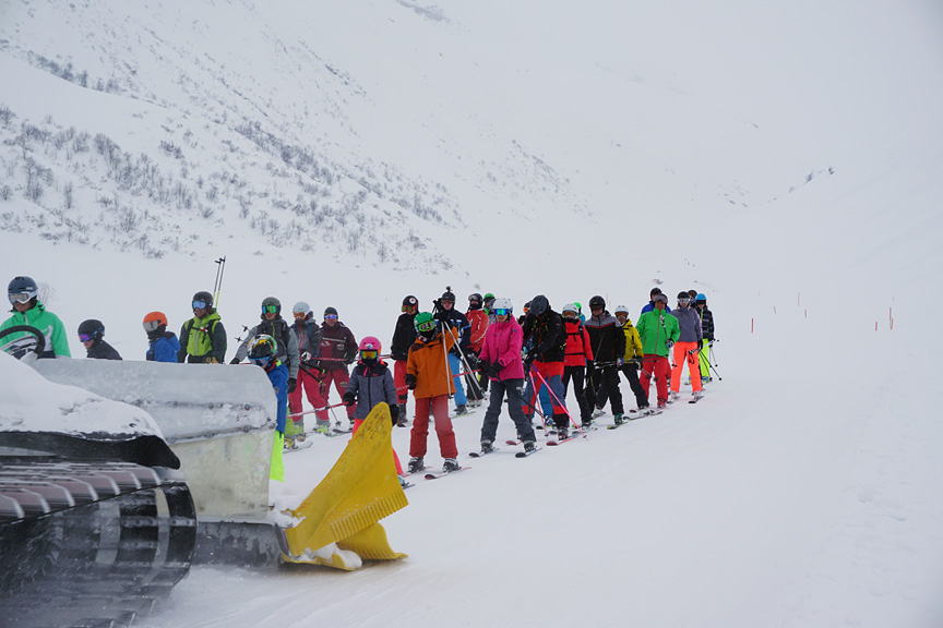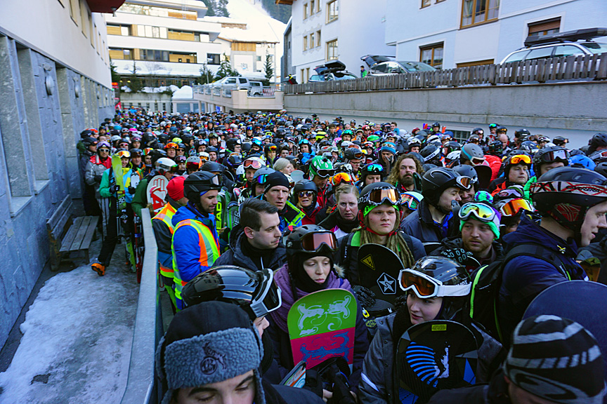 Our first challenge, was to get onto the lift system at the busy Ischgl ski area! Although a frightening sight, this crowd moved onto the lift and up the hill faster than you might at first think. |