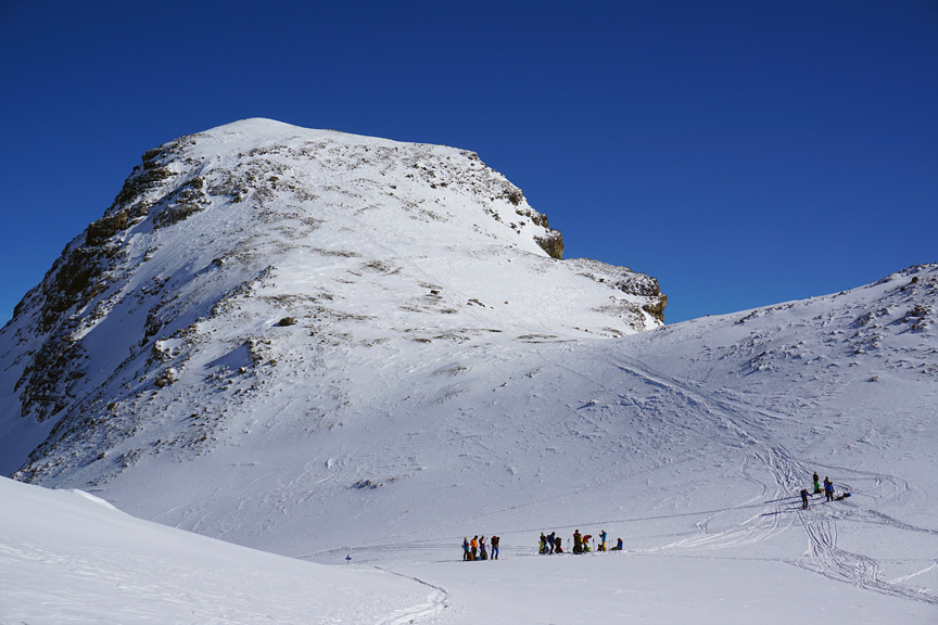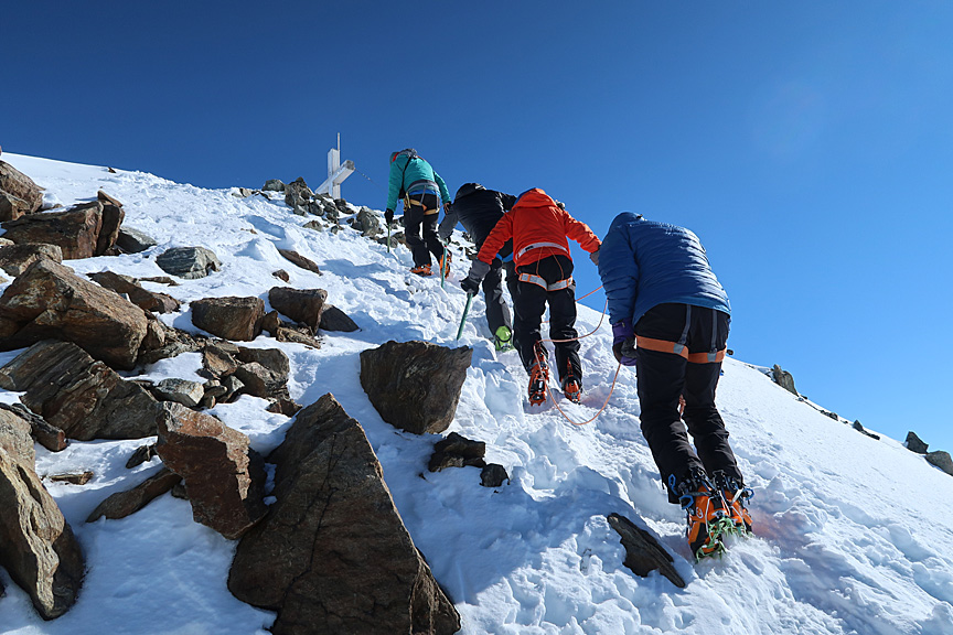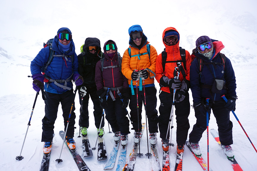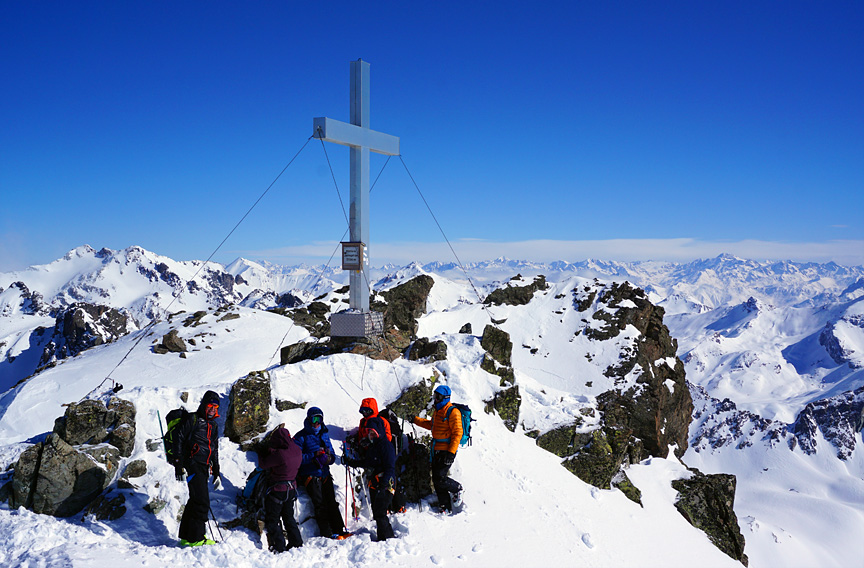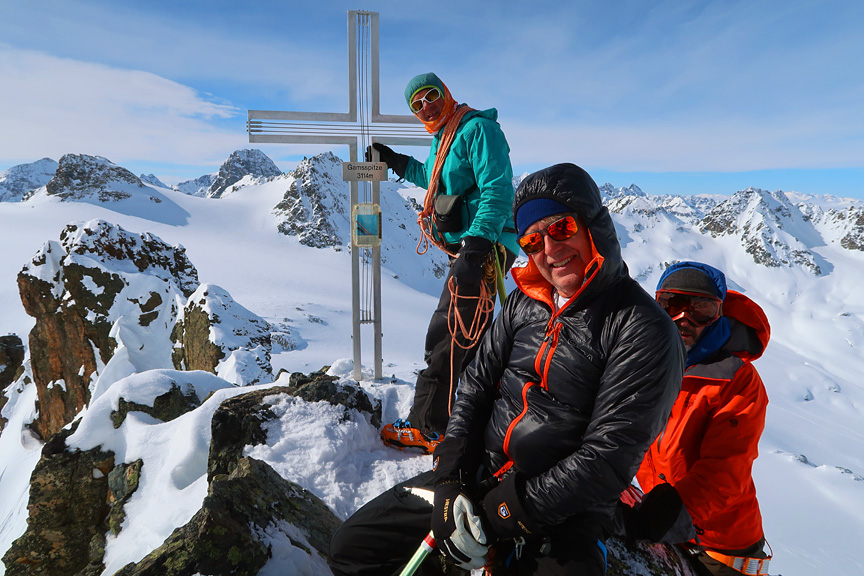 Much of the group took advantage of the calm air and relative warmth to tag the summit of the Dreiländerspitze. |