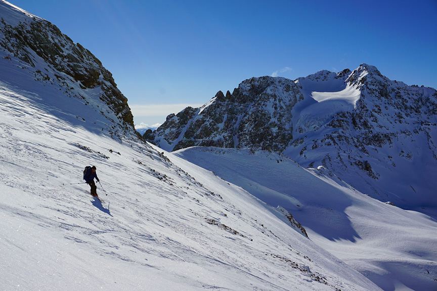 Before heading back to the hut, we decided to make a loop of it by hopping over a narrow col into the Chalausferner glacier. Kathy dropping off the north side of the col. |