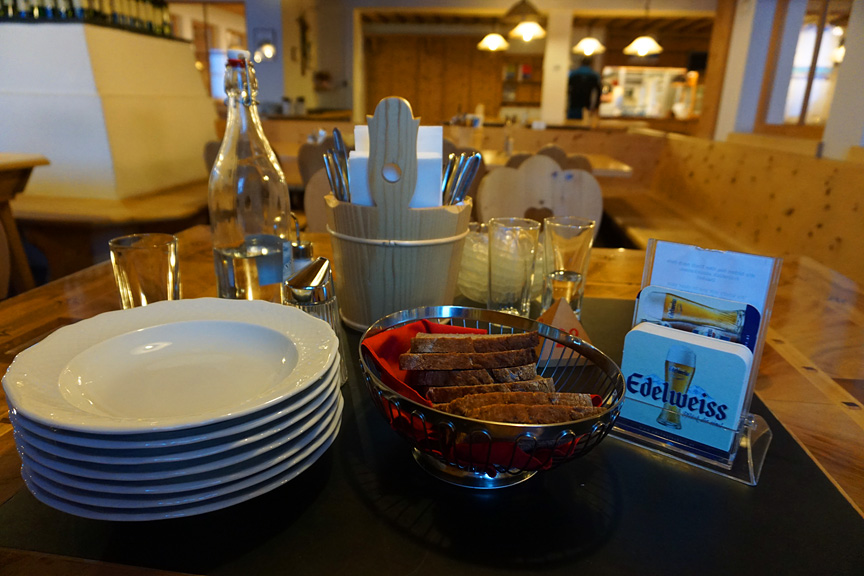 The comforts of hut living are at their best in the Jamtal hut! Afternoon soup and maybe a beer later. |