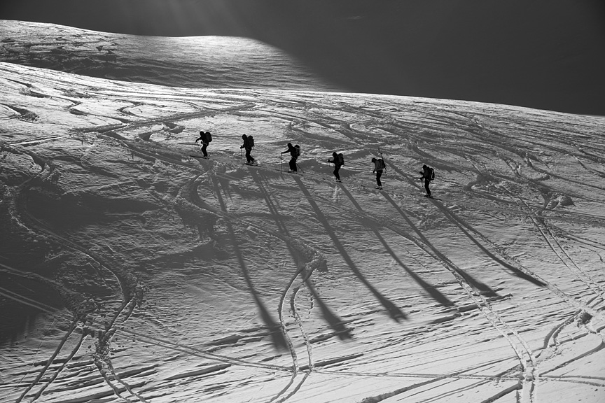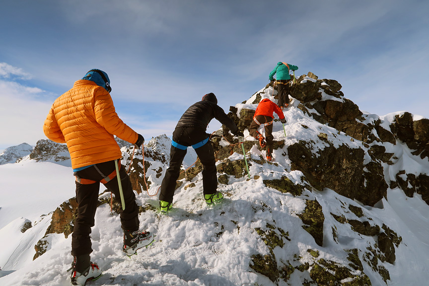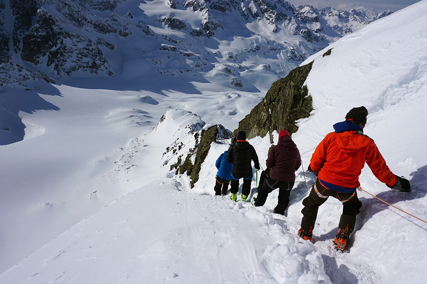 Day five, our objective is to climb the Piz Buin. Although beautifully sunny, this day featured more biting winds, forcing us to climb in every stitch of clothing we had with us. |
